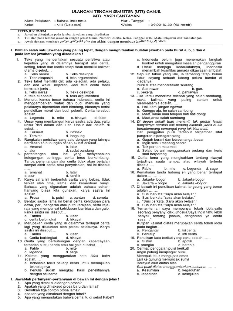 Setelah membagikan kumpulan soal ulangan tengah semester (uts), ulangan kenaikan kelas (ukk) dan ujian . Kunci jawaban (pembahasan) latihan soal uas / pas bahasa indonesia kelas 8 smp/mts semester 1 (kurikulum 2013) (download). Demikianlah rangkuman materi untuk kelas viii semoga bermanfaat ya. Bahan ajar bahasa indonesia buku paket download ringkasan ilmu pengetahuan sosial ktsp . Doc) soal uts bahasa indonesia kelas 9 semester ganjil | hamzah attamimi.